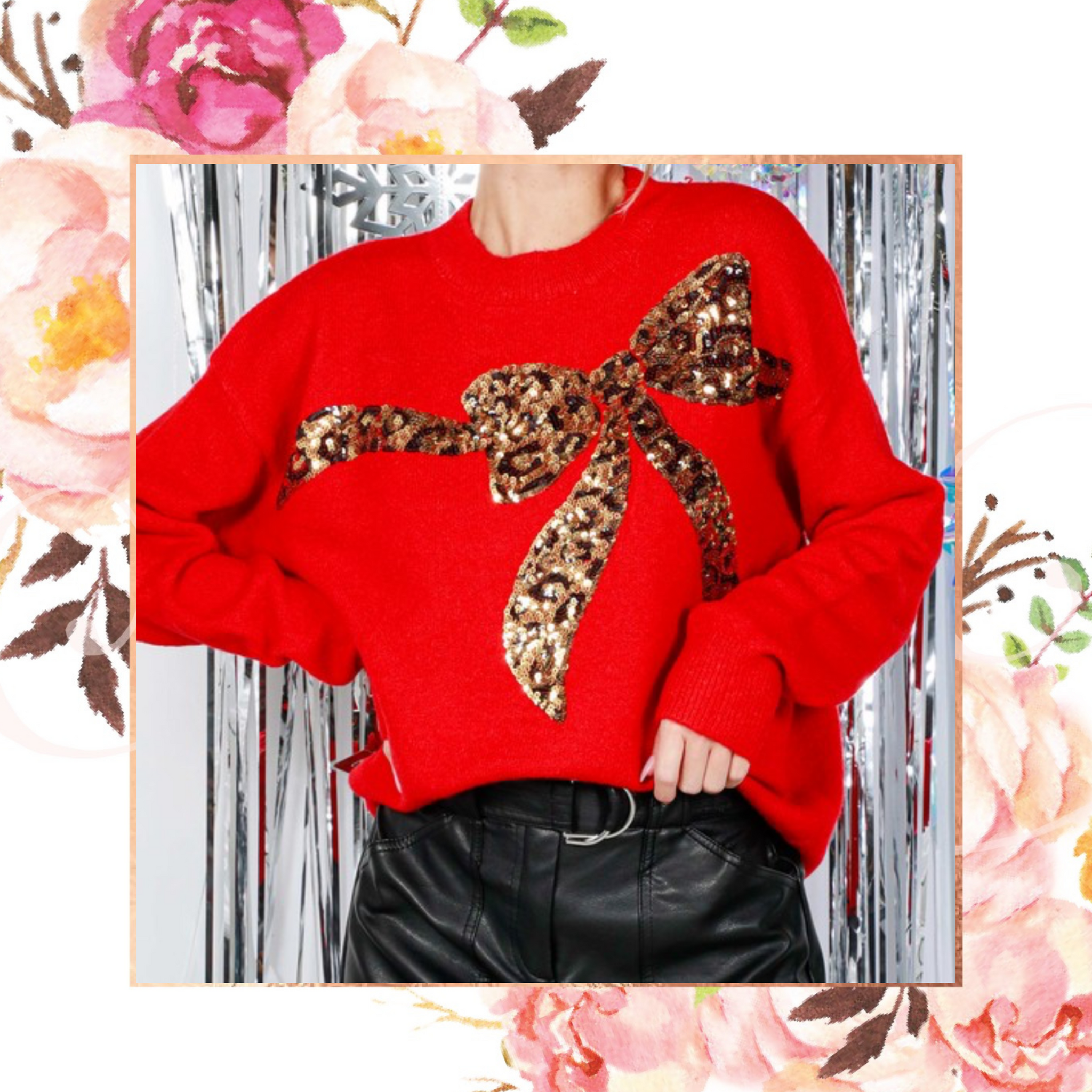 Expertly crafted with a round neck and long sleeves, this leopard sequin bow sweater offers a touch of glamour to your wardrobe. The eye-catching sequin bow adds a playful yet sophisticated detail to this classic design. Stay warm and stylish with this must-have statement piece.