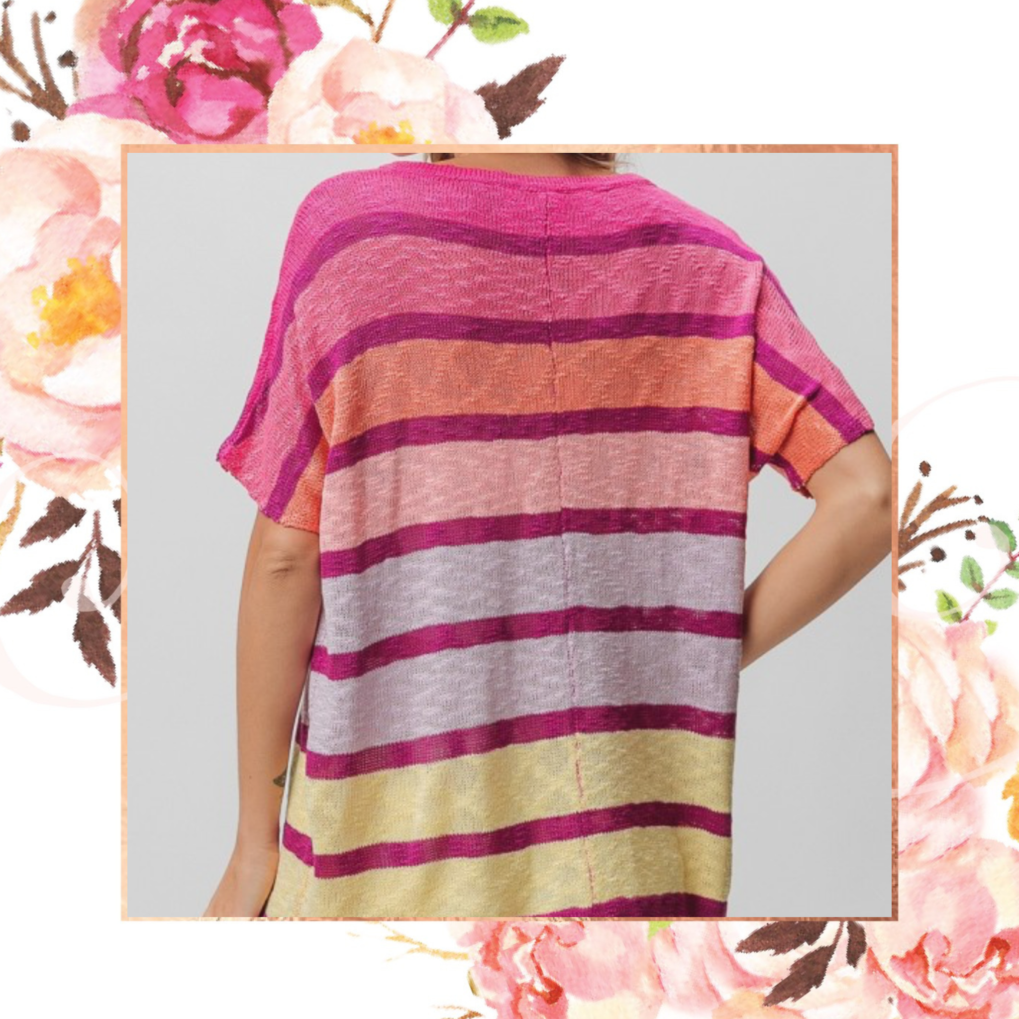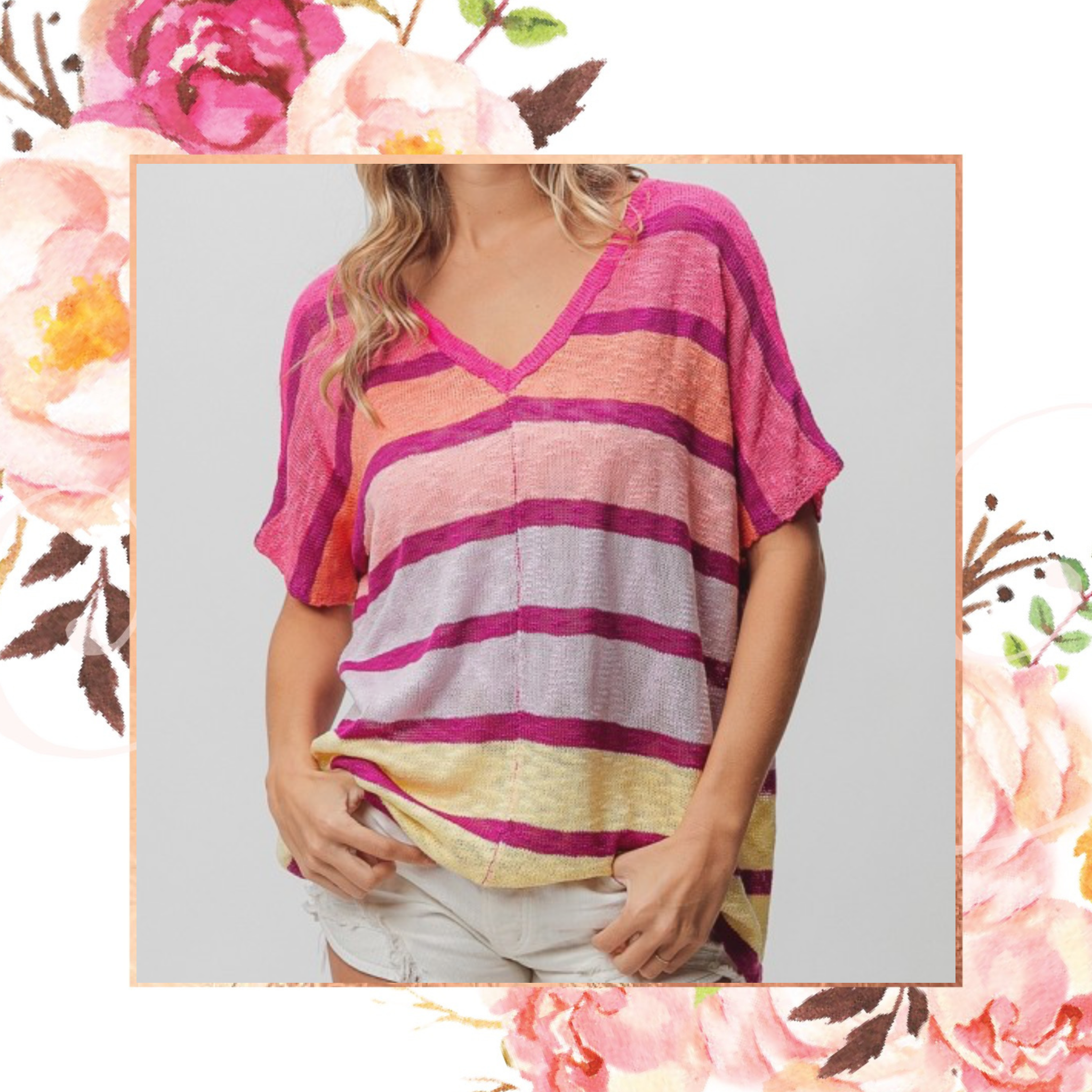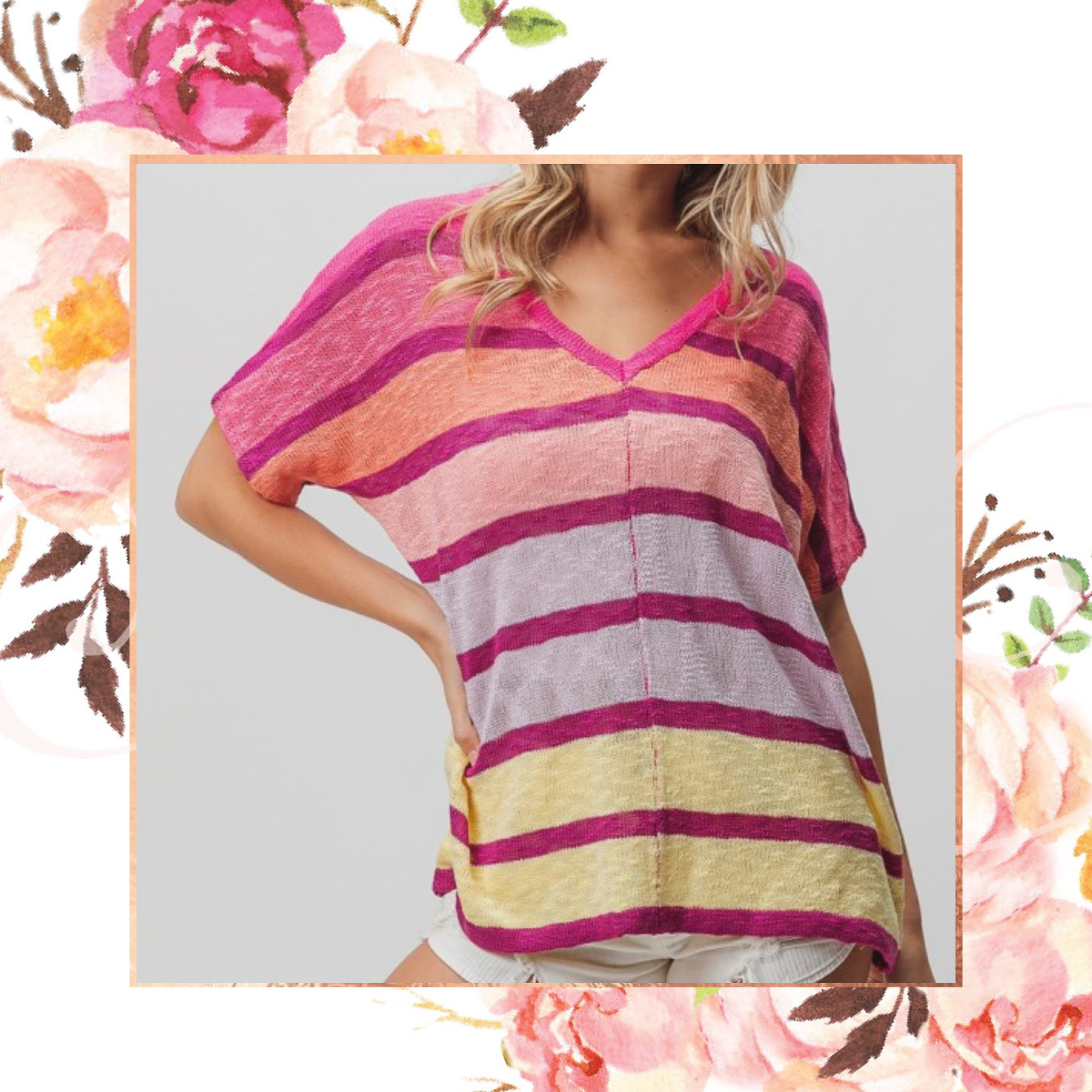 Embrace effortless style with our Multi Striped Knit Top! This lightweight, soft v-neck piece features short sleeves and a charming middle seam, making it perfect for any occasion. Feel the comfort and enjoy the flattering fit that brings a vibrant energy to your wardrobe!
