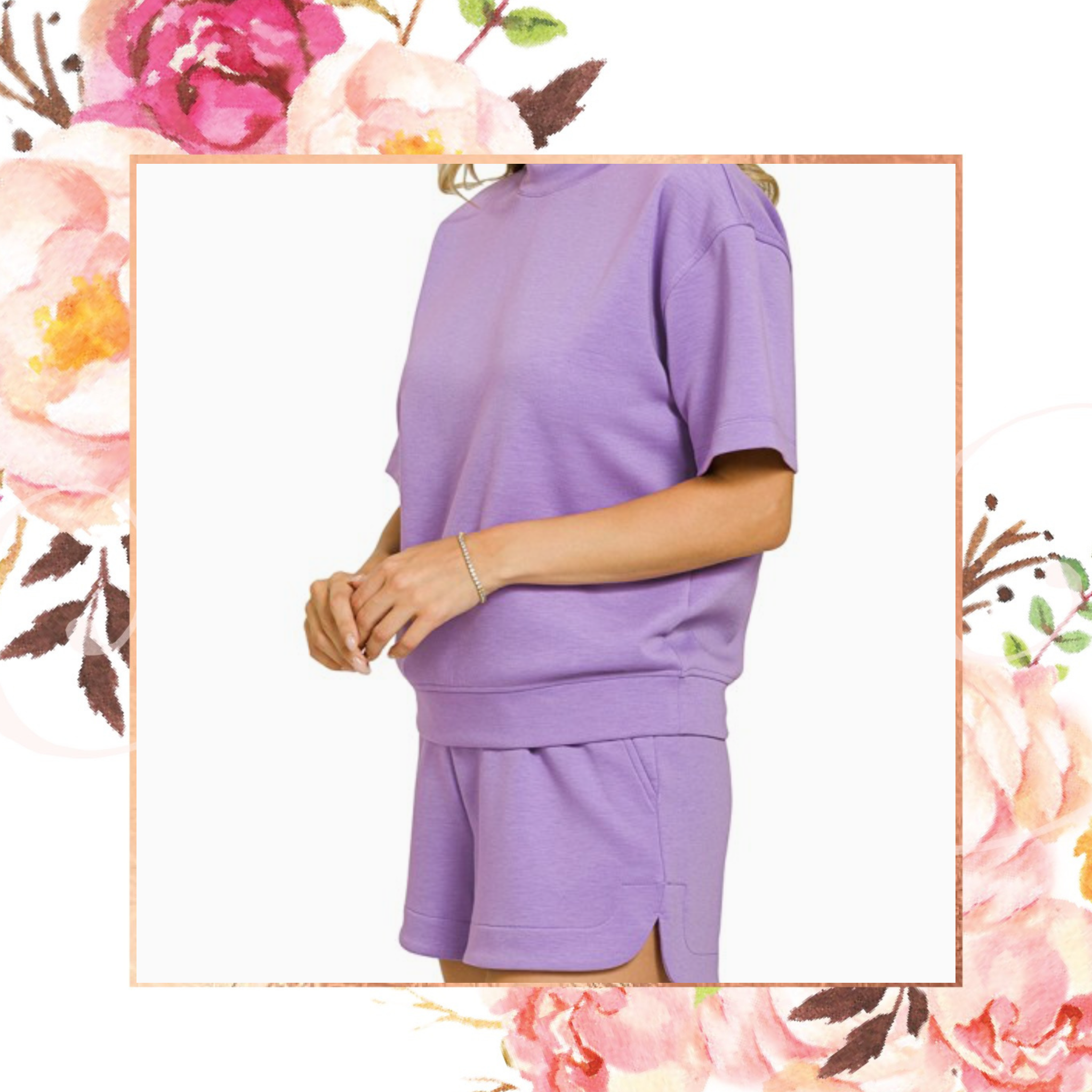 Dive into comfort with the Scuba Mock Neck Set of the Season. This stylish mock neck top pairs perfectly with elastic waist dolphin shorts, featuring handy side pockets. Ideal for a day at the beach or lounging at home, it's designed to keep you relaxed and ready for anything.