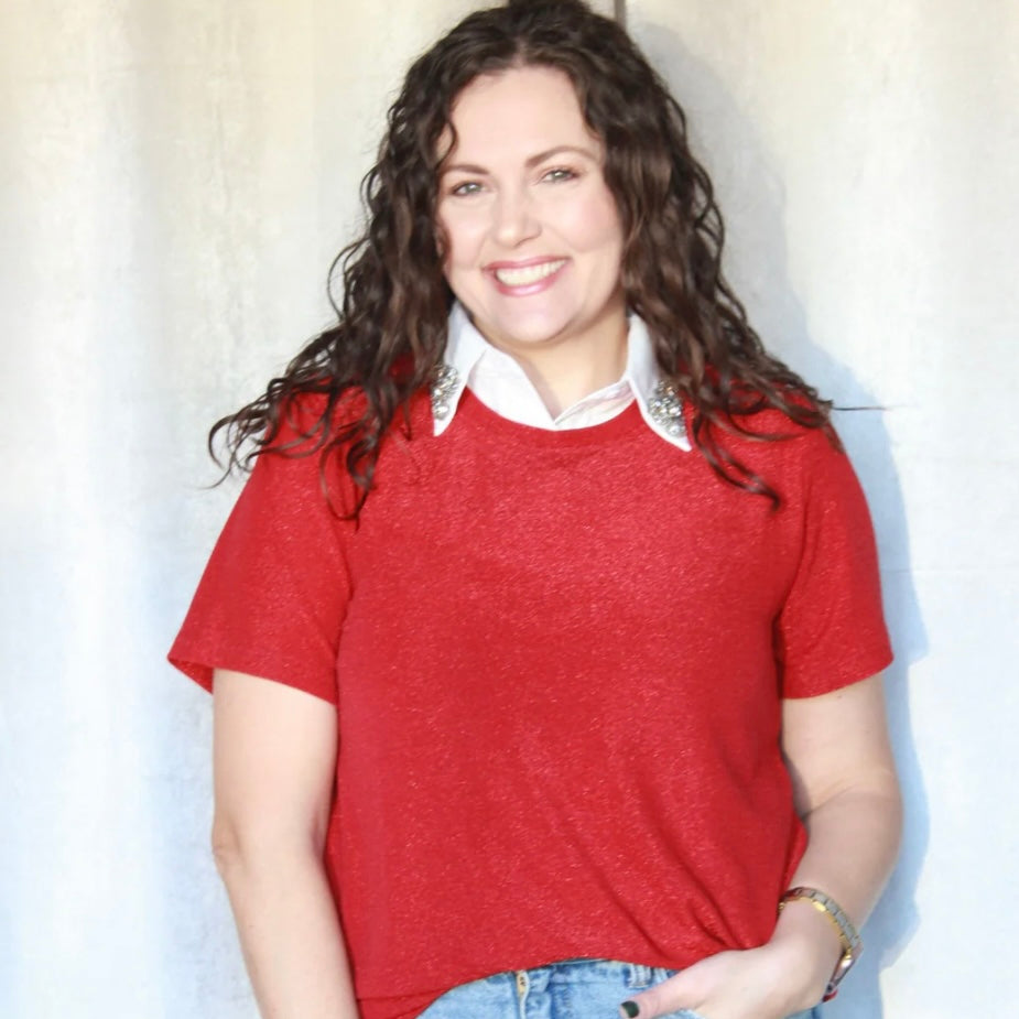 The Sparkle Signature tee is the perfect amount of glitz for the holidays or cheering on your favorite school or team! The nature of this fabric is a little more generous and stretchy, so you may consider sizing down. Made in this fun, red sparkle with short sleeves and a scoop neckline, this everyday tee can keep you casual and in style.